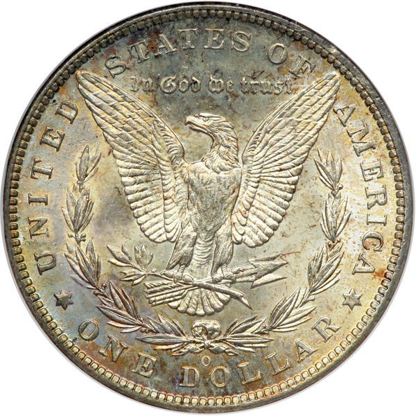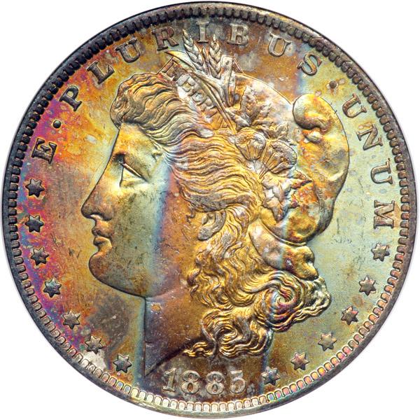1885-O Morgan Dollar. NGC graded MS-64. Intense rainbow colors are laid out nicely over the entire obverse. The reverse is toned in a more subtle manner (PCGS # 7162) .
