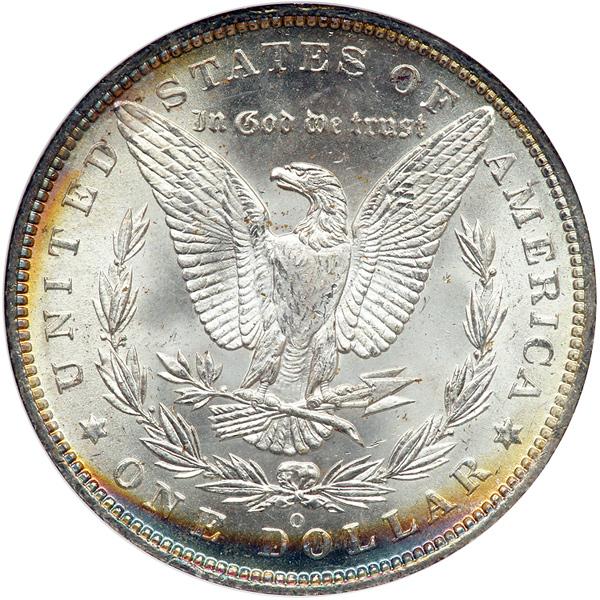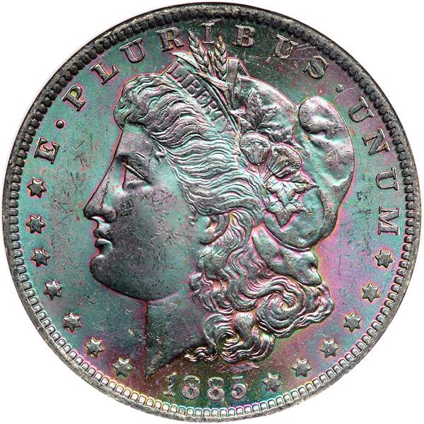 1885-O Morgan Dollar. NGC graded MS-64. Lovely green obverse toning shading into blue with similar iridescent magenta accents. Mostly white reverse (PCGS # 7162) .