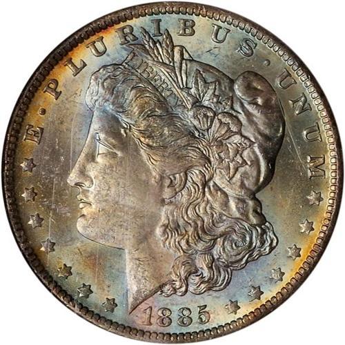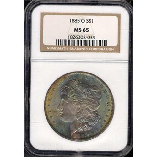 <b>1885-O Morgan Dollar. NGC graded MS65.</b> Wonderful rich deep shades of toning grade the obverse with keen-edge devices underlying the color to exemplify its bold strike. A frosty gem <b>(PCGS # 7162)</b>