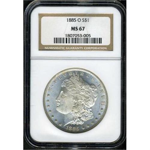 <b>1885-O Morgan Dollar. NGC graded MS67.</b> Meticulous strike on every device, including the centers. A lustrous Gem that has exquisite surfaces and a very good strike in keeping with its superb MS67 ranking. This coin strikes us as the sort of coin any collector, young or old, novice or experienced would want to acquire <b>(PCGS # 7162)</b>