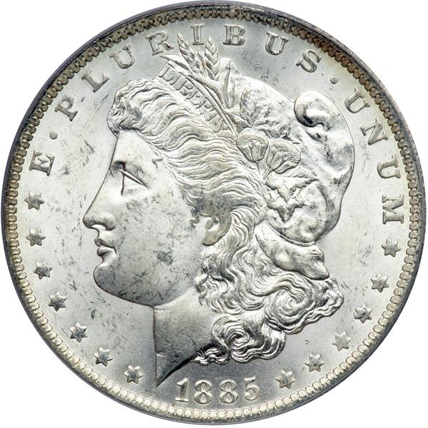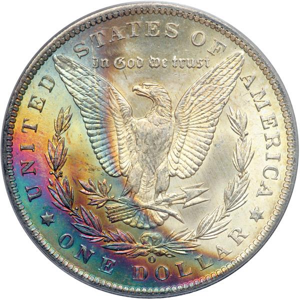 1885-O Morgan Dollar. PCGS graded MS-63. The obverse is white while the reverse exhibits tantalizing rainbow toning (PCGS # 7162) .