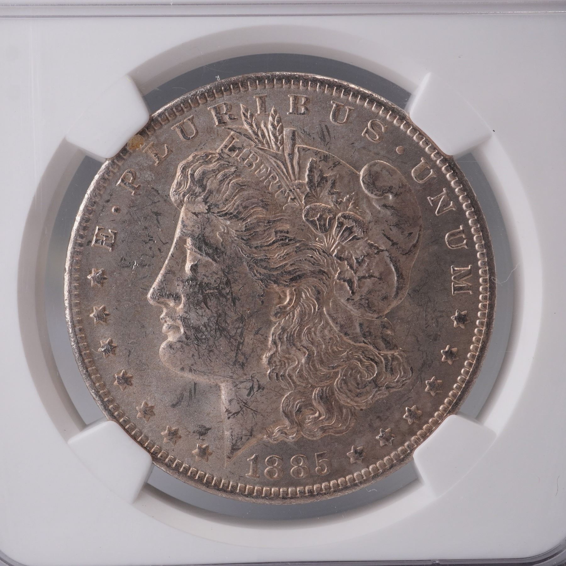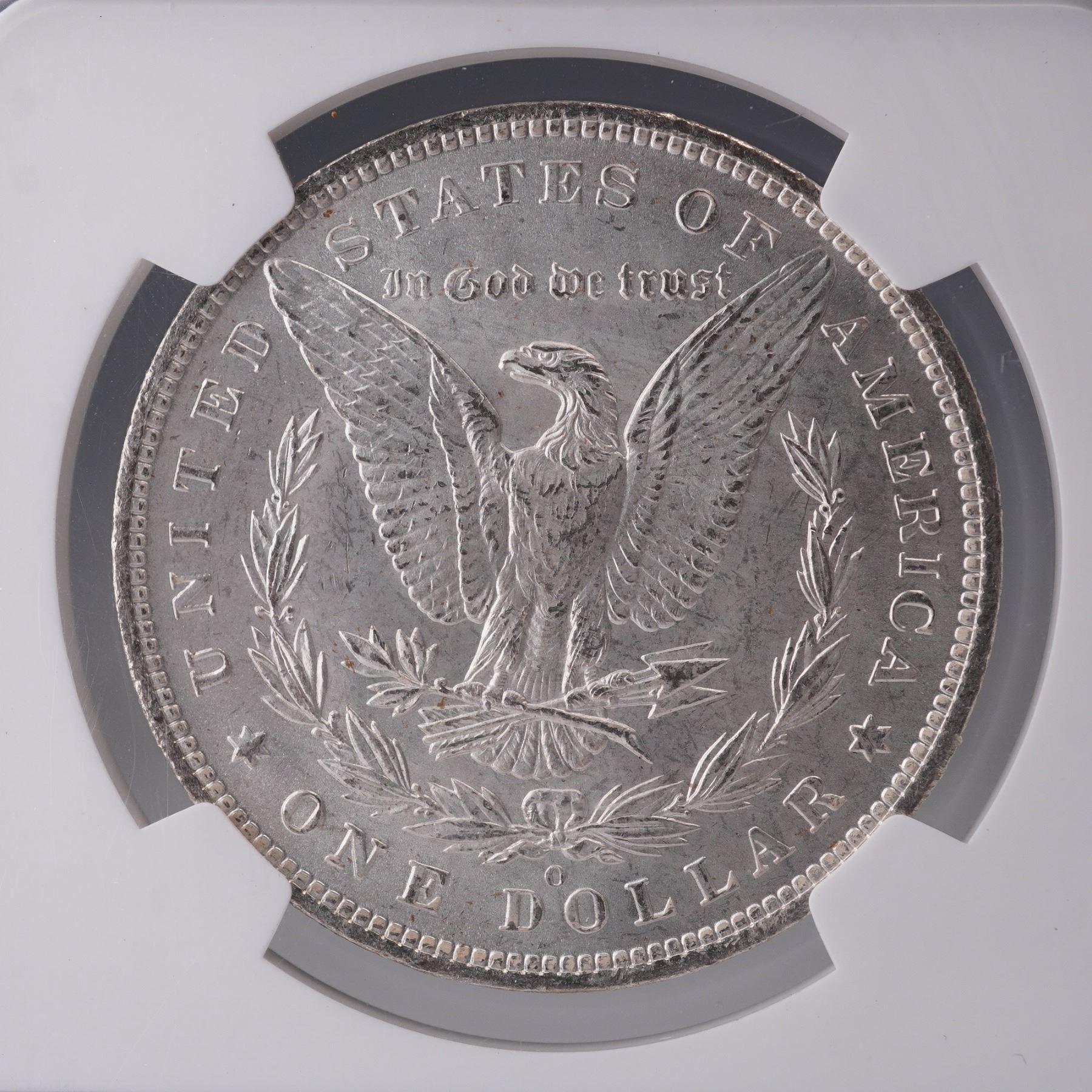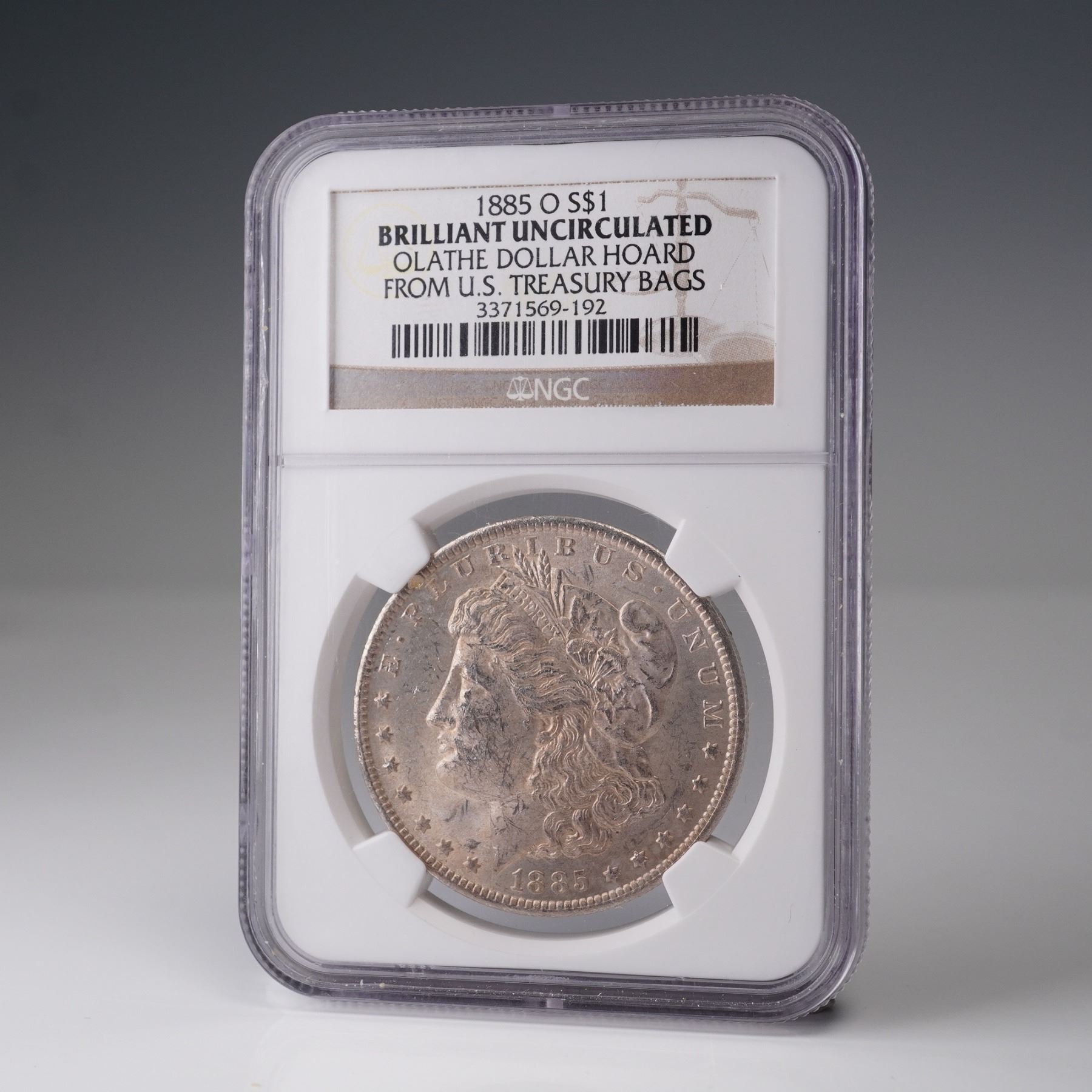 United States Morgan Silver Dollar struck at the New Orleans Mint in 1885, featuring the "O" mintmark on the reverse. Graded Brilliant Uncirculated by Numismatic Guaranty Corporation (NGC) and encapsulated in a secure holder labeled from the Olathe Dollar Hoard, originally distributed from U.S. Treasury bags. The obverse displays a left-facing portrait of Lady Liberty wearing a Phrygian cap adorned with a ribbon inscribed LIBERTY, flanked by two cotton blossoms and two wheat heads. The reverse depicts an eagle with outstretched wings clutching arrows and an olive branch, encircled by a laurel wreath. The inscriptions include UNITED STATES OF AMERICA, IN GOD WE TRUST, and ONE DOLLAR. This coin is composed of 90 percent silver and 10 percent copper with a reeded edge and measures approximately 38.1mm in diameter. Certified and sealed by NGC. Slab: 2.25"L x 0.5"W x 3.25"H. Coin diameter: 38.1mm.