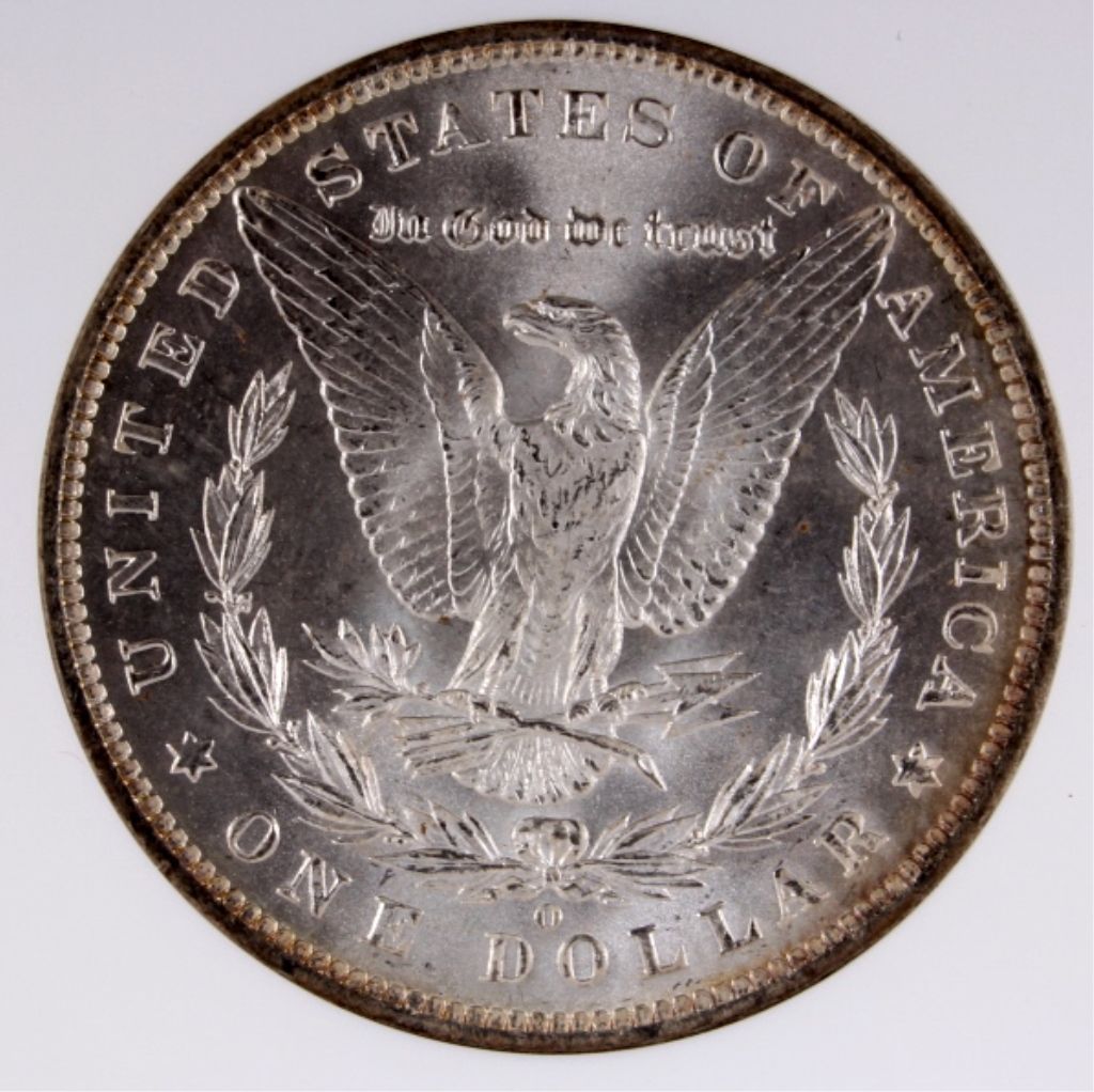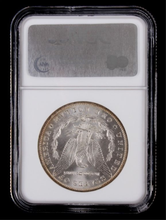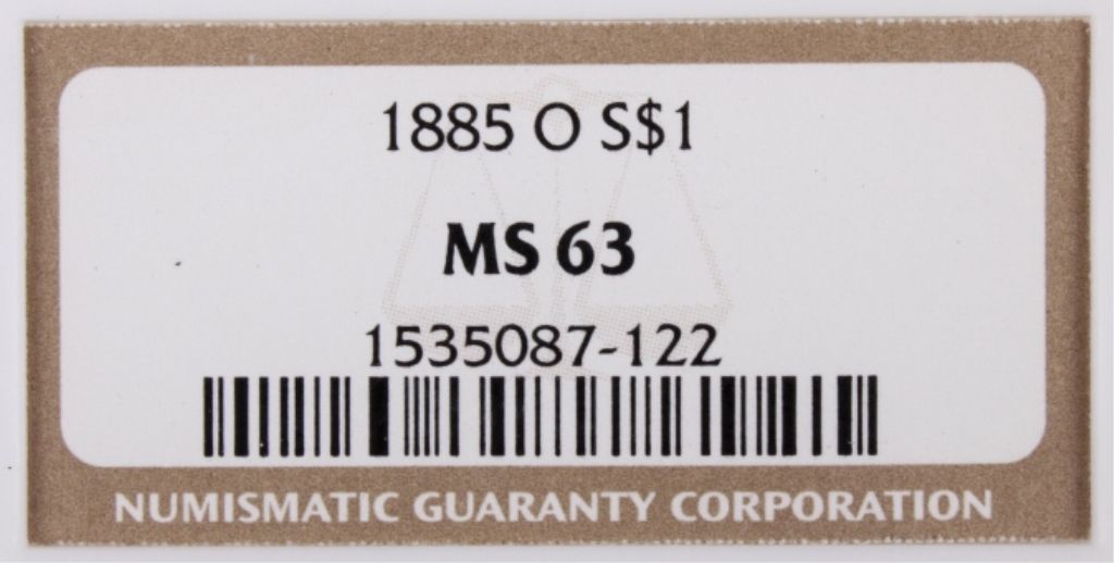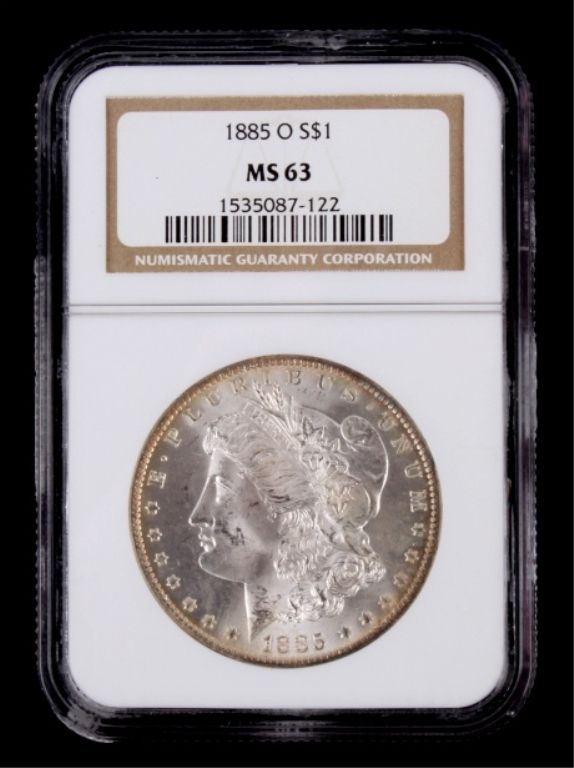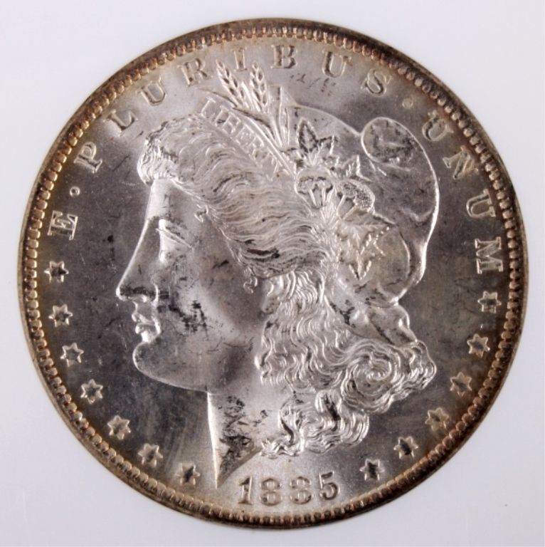 This coins was struck at the New Orleans Mint in 1885. The coin was graded and sealed by Numismatic Guaranty Corporation. Graded at Mint State 63 which means this is an uncirculated coin. Slight gold tone aroundthe edge on the reverse.