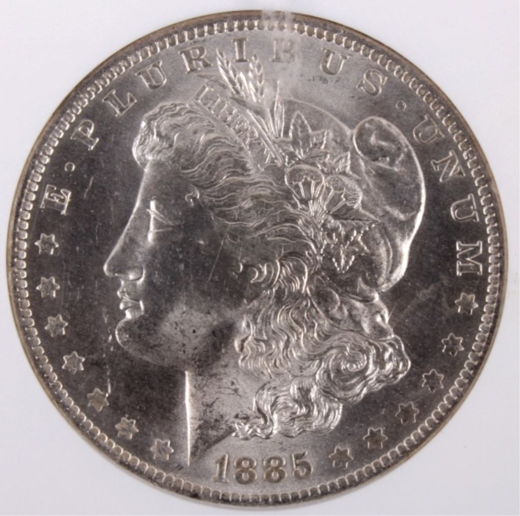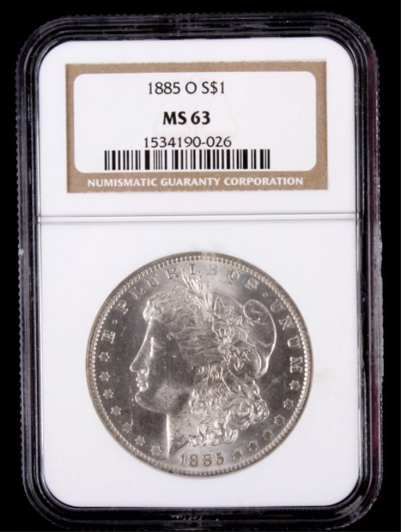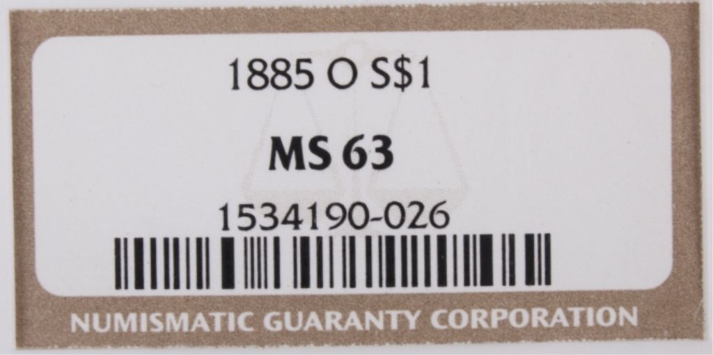 This coins was struck at the New Orleans Mint in 1885. The coin was graded and sealed by Numismatic Guaranty Corporation. Graded at Mint State 63 which means this is an uncirculated coin. Bright White.