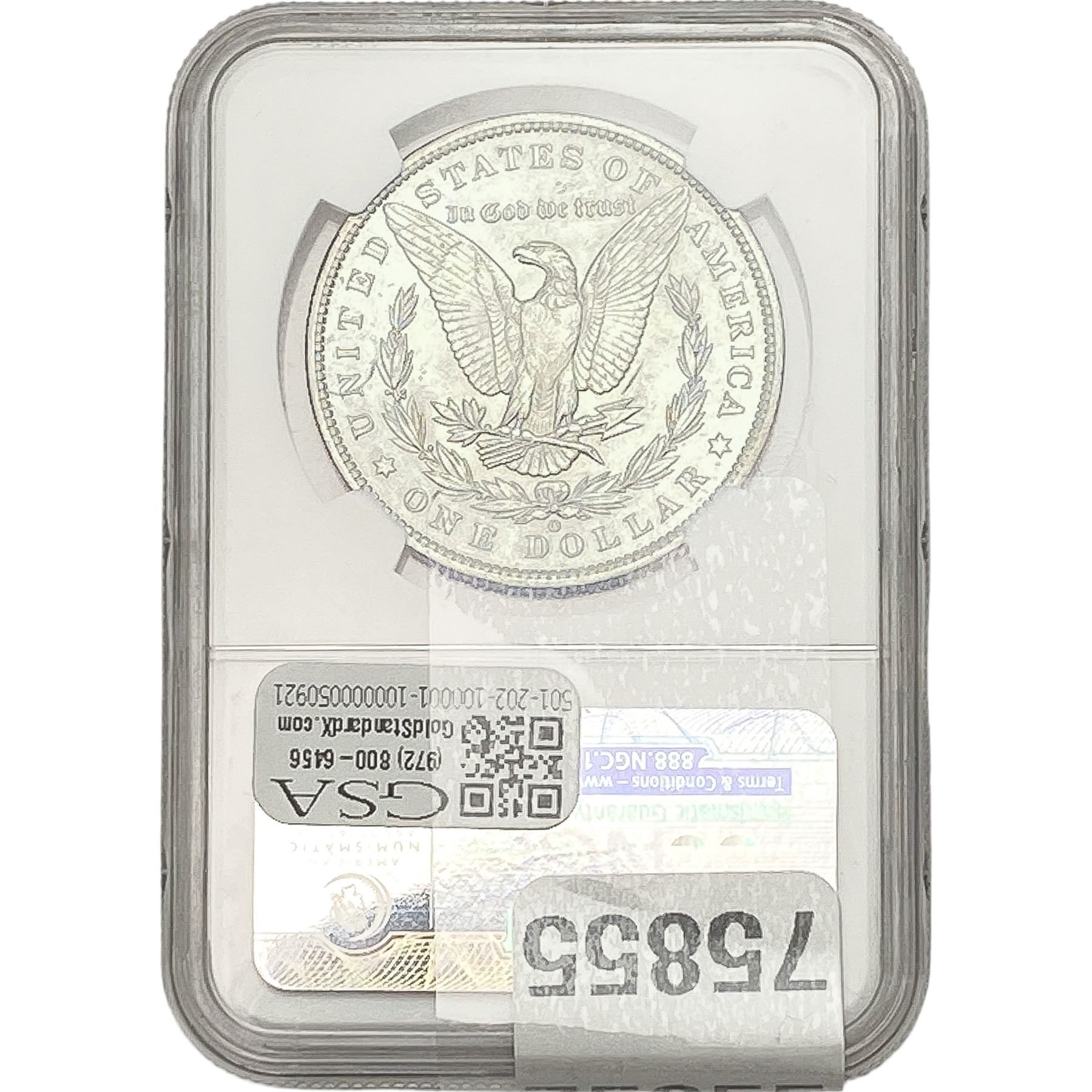 COINS AND CURRENCY LISTED IN GSA’S CATALOG AS GRADED AND ENCAPSULATED BY PCGS, NGC, ANACS, ICG, PCGS CURRENCY, PMG, PCGS BANKNOTE GRADING, CMC OR ANY OTHER THIRD-PARTY GRADING SERVICE ARE LIKEWISE SOLD “AS-IS” EXCEPT AS EXPRESSLY SET FORTH HEREIN. ALL THIRD-PARTY GRADING SERVICE GUARANTEES, INCLUDING AUTHENTICITY, ARE THE SOLE RESPONSIBILITY OF THE THIRD-PARTY GRADING SERVICE AND NOT WARRANTIES OR GUARANTEES OF GSA. BIDDERS SHOULD CONTACT THESE THIRD-PARTY GRADING SERVICES DIRECTLY WITH RESPECT TO ANY CLAIMS OR QUESTIONS THEY MAY HAVE CONCERNING THEIR GUARANTEES AND WARRANTIES. BIDDERS ACKNOWLEDGE AND AGREE THAT AUCTIONEER IS NOT BOUND BY OR LIABLE FOR ANY OPINION OR CERTIFICATION BY ANY THIRD-PARTY GRADING SERVICE. REMOVAL OF A PRODUCT FROM ITS PROTECTIVE CASING OR HOLDER OR ALTERATION OF ANY COIN HOLDER WAIVES ALL RIGHTS CONCERNING THE PRODUCT CONTAINED THEREIN.