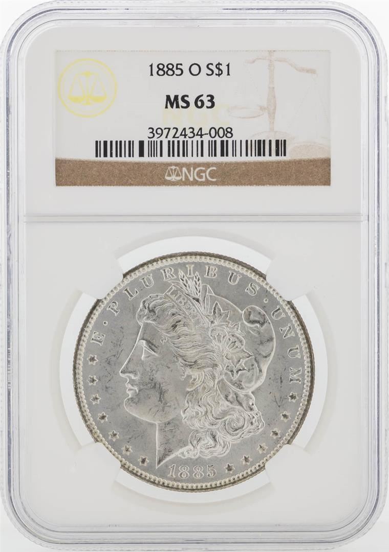 One 1885-O NGC MS63 Morgan Silver Dollar.
