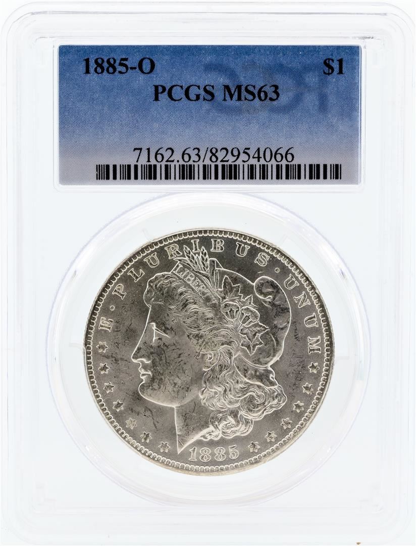 One 1885-O PCGS MS63 Morgan Silver Dollar.