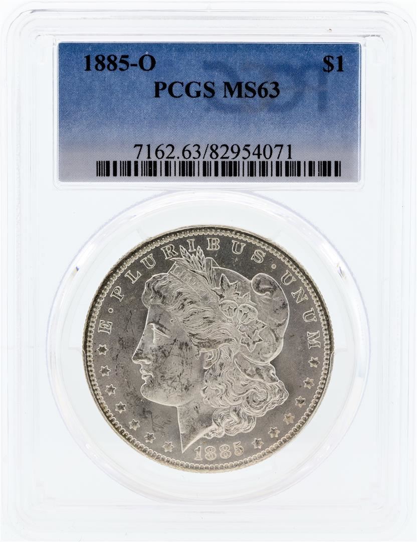 One 1885-O PCGS MS63 Morgan Silver Dollar.