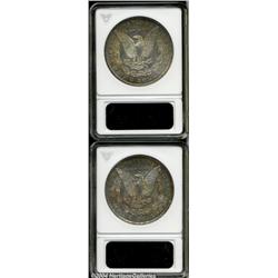 <B>1885-O<S$1> MS64 ANACS,</B></I> toned in aqua-blue, lavender, and burnt-orange colors, with a light horizontal abrasion on the lower part of the eagle's breast; and an <B>1885-O MS64 ANACS,</B></I> sea-green and burnt-orange toning on the obverse, and variegated burnt-orange, lavender, and aqua on the reverse, and a small diagonal abrasion on the upper part of the eagle's breast. 2 Coins <BR><BR><B>Important notice:</B> Heritage usually auctions material at the rate of 200-250 lots per hour. On some occasions eBay Live bid software or the Internet may not be able to keep up with the pace of the auction. We recommend placing a realistic absentee bid now as insurance to avoid disappointment. Occasionally the auctioneer may eliminate or reject an eBay Live bid, and the auctioneer may also reopen a lot after the close of the eBay live bidding (usually because we missed an audience bid), and may reject your bid even if it shows you as the winning bidder. By bidding via eBay Live, you agree that Heritage may award the lot to another bidder at its sole discretion under the circumstances described above or any other reasonable circumstances. Since eBay bids are not shown to us until we open the lot on the floor, we treat those bids just like floor bids. In most cases the floor responds before the eBay bid is presented to us, due to Internet lag time, so for consistency we have made it a policy that floor bids are always considered first over tie eBay live bids. Also please note that all Heritage lots purchased through eBay Live carry a 20% Buyer's Premium. Please make sure you read the Terms and Conditions before you bid. </span></font></tr></table></td></tr></table>