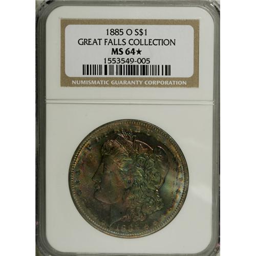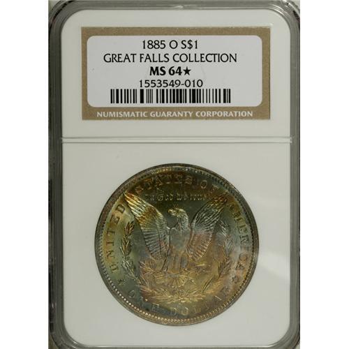 <B>1885-O S$1 MS64 <img border='0' src='http://www.heritagecoins.com/images/star.gif' width=10 height=10> NGC,</B></I> the obverse is wildly toned in violet-red, apple-green, powder-blue, and gold; and an <B>1885-O MS64 <img border='0' src='http://www.heritagecoins.com/images/star.gif' width=10 height=10> NGC,</B></I> the reverse features exciting apricot, lavender, sky-blue and lime patina.<BR><I>From The Great Falls Collection.</B></I><BR><BR><b>Shipping:</b> Coins & Currency (<a target="_blank" href="http://www.heritageauctions.com/common/shipping.php">view shipping information</a>)