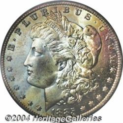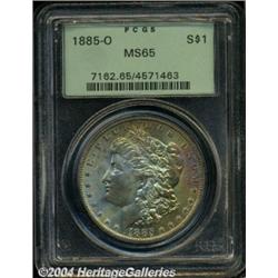 <B>1885-O<S$1> MS65 PCGS.</B></I> The obverse is toned a soft, ice-blue, gold, and magenta color while the opposite side is completely white. Clean surfaces, a typical, slightly soft strike shows in the centers.<BR><I>From the JFS Collection.</B></I> <BR><BR><B>Important notice:</B> Heritage usually auctions material at the rate of 200-250 lots per hour. On some occasions eBay Live bid software or the Internet may not be able to keep up with the pace of the auction. We recommend placing a realistic absentee bid now as insurance to avoid disappointment. Occasionally the auctioneer may eliminate or reject an eBay Live bid, and the auctioneer may also reopen a lot after the close of the eBay live bidding (usually because we missed an audience bid), and may reject your bid even if it shows you as the winning bidder. By bidding via eBay Live, you agree that Heritage may award the lot to another bidder at its sole discretion under the circumstances described above or any other reasonable circumstances. Since eBay bids are not shown to us until we open the lot on the floor, we treat those bids just like floor bids. In most cases the floor responds before the eBay bid is presented to us, due to Internet lag time, so for consistency we have made it a policy that floor bids are always considered first over tie eBay live bids. Also please note that all Heritage lots purchased through eBay Live carry a 20% Buyer's Premium. Please make sure you read the Terms and Conditions before you bid. </span></font></tr></table></td></tr></table>