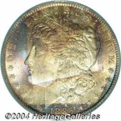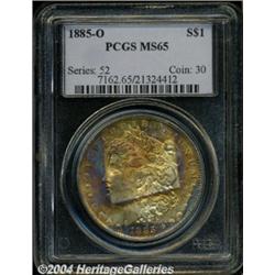 <B>1885-O<S$1> MS65 PCGS.</B></I> A patchwork toning design decorates the obverse in antique-gold and cobalt-blue hues, the reverse is untoned. Just a few small contact marks are seen under close examination.<BR><I>From the JFS Collection.</B></I> <BR><BR><B>Important notice:</B> Heritage usually auctions material at the rate of 200-250 lots per hour. On some occasions eBay Live bid software or the Internet may not be able to keep up with the pace of the auction. We recommend placing a realistic absentee bid now as insurance to avoid disappointment. Occasionally the auctioneer may eliminate or reject an eBay Live bid, and the auctioneer may also reopen a lot after the close of the eBay live bidding (usually because we missed an audience bid), and may reject your bid even if it shows you as the winning bidder. By bidding via eBay Live, you agree that Heritage may award the lot to another bidder at its sole discretion under the circumstances described above or any other reasonable circumstances. Since eBay bids are not shown to us until we open the lot on the floor, we treat those bids just like floor bids. In most cases the floor responds before the eBay bid is presented to us, due to Internet lag time, so for consistency we have made it a policy that floor bids are always considered first over tie eBay live bids. Also please note that all Heritage lots purchased through eBay Live carry a 20% Buyer's Premium. Please make sure you read the Terms and Conditions before you bid. </span></font></tr></table></td></tr></table>
