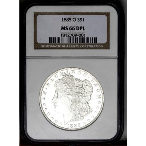 <B>1885-O<img border='0' src='http://www.heritagecoins.com/images/star.gif' width=10 height=10>$1 MS66 Deep Mirror Prooflike NGC.</B></I> This intricately struck premium Gem has noticeable frost on both major devices. A fingerprint is noted on the reverse near 8 o'clock, otherwise a brilliant and exceptionally well preserved New Orleans Morgan Dollar. Census: 13 in 66, 1 finer (12/05).