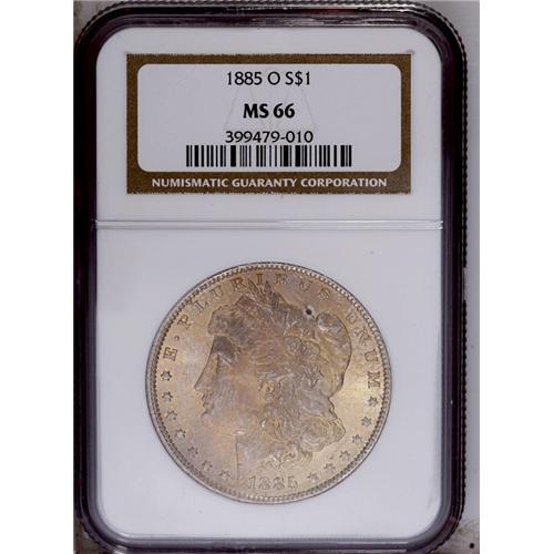 <B>1885-O<img border='0' src='http://www.heritagecoins.com/images/star.gif' width=10 height=10>$1> MS66 NGC.</B></I> A thin veneer of golden-tan patina overruns the obverse, while the reverse is essentially untoned, and the design elements are sharply impressed. Lustrous surfaces exhibit a few minor grazes on Liberty's cheek and neck. <BR><BR><B>Important notice:</B> Heritage usually auctions material at the rate of 200-250 lots per hour. On some occasions eBay Live bid software or the Internet may not be able to keep up with the pace of the auction. We recommend placing a realistic absentee bid now as insurance to avoid disappointment. Occasionally the auctioneer may eliminate or reject an eBay Live bid, and the auctioneer may also reopen a lot after the close of the eBay live bidding (usually because we missed an audience bid), and may reject your bid even if it shows you as the winning bidder. By bidding via eBay Live, you agree that Heritage may award the lot to another bidder at its sole discretion under the circumstances described above or any other reasonable circumstances. Since eBay bids are not shown to us until we open the lot on the floor, we treat those bids just like floor bids. In most cases the floor responds before the eBay bid is presented to us, due to Internet lag time, so for consistency we have made it a policy that floor bids are always considered first over tie eBay live bids. Also please note that all Heritage lots purchased through eBay Live carry a 20% Buyer's Premium. Please make sure you read the Terms and Conditions before you bid. This lot is being auctioned in conjunction with a live floor auction by Heritage Galleries & Auctioneers. All final auction and invoice information will be supplied by Heritage Galleries & Auctioneers, and all other information should be considered preliminary. Lot:3447 <BR><BR><B>Winning Notification and Billing:</B> After the FINAL session in this auction is complete, Heritage will send e-mail and snail mail invoices. This process normally takes several days. All final auction and invoice information will be supplied by Heritage Galleries & Auctioneers, and all other information should be considered preliminary. <BR><BR>This auction will be conducted on a live auction floor and over the Internet through eBay Live. If you choose to place an absentee bid, please take a moment to <font color='#0000ff'><u><a href='http://pages.ebay.com/liveauctions/help/before/laabsentee.html'>learn how eBay Live absentee bidding works</a></u></font><font color='#000000'>
