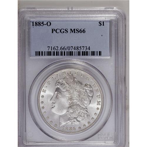 <B>1885-O<img border='0' src='http://www.heritagecoins.com/images/star.gif' width=10 height=10>$1> MS66 PCGS.</B></I> A fully brilliant and well preserved O-mint silver dollar that has a decent strike and strong cartwheel luster.