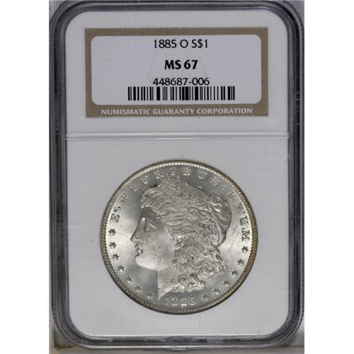 <B>1885-O<img border='0' src='http://www.heritagecoins.com/images/star.gif' width=10 height=10>$1> MS67 NGC.</B></I> An attractive Superb Gem with subtle dusty rose patina. Great luster and a sharp strike, though small dark spots are noted on the obverse.
