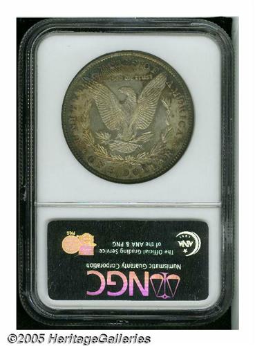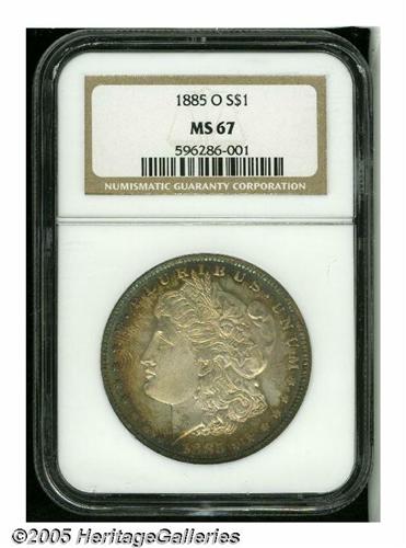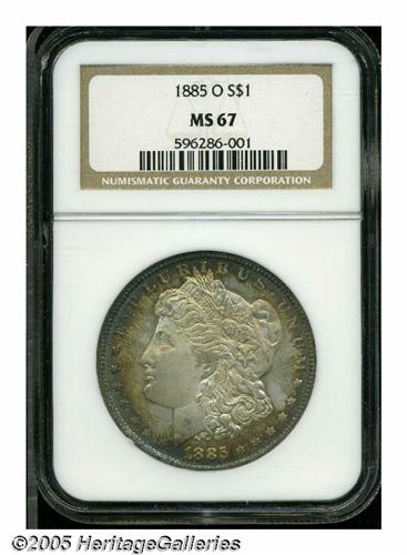 <B>1885-O<S$1> MS67 NGC.</B></I> Peripheral electric-blue and golden-russet patina frames near-brilliant centers. Lustrous surfaces are devoid of notable marks, however the strike is a little soft at the centers. Population: 247 in 67, 8 finer (5/05).