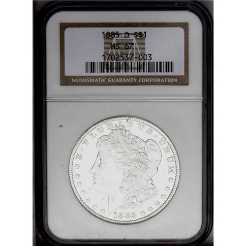 <B>1885-O<img border='0' src='http://www.heritagecoins.com/images/star.gif' width=10 height=10>$1> MS67 NGC.</B></I> Silver-gray surfaces show a pleasing frosty luster, and are seemingly devoid of mentionable marks. The design elements are strongly impressed, with only the hair over Liberty's ear exhibiting some minor weakness. This issue is rare above the MS67 level, as evidenced by only eight pieces grading higher having been seen by NGC, and none by PCGS (3/06). <BR><BR><B>Important notice:</B> Heritage usually auctions material at the rate of 200-250 lots per hour. On some occasions eBay Live bid software or the Internet may not be able to keep up with the pace of the auction. We recommend placing a realistic absentee bid now as insurance to avoid disappointment. Occasionally the auctioneer may eliminate or reject an eBay Live bid, and the auctioneer may also reopen a lot after the close of the eBay live bidding (usually because we missed an audience bid), and may reject your bid even if it shows you as the winning bidder. By bidding via eBay Live, you agree that Heritage may award the lot to another bidder at its sole discretion under the circumstances described above or any other reasonable circumstances. Since eBay bids are not shown to us until we open the lot on the floor, we treat those bids just like floor bids. In most cases the floor responds before the eBay bid is presented to us, due to Internet lag time, so for consistency we have made it a policy that floor bids are always considered first over tie eBay live bids. Also please note that all Heritage lots purchased through eBay Live carry a 20% Buyer's Premium. Please make sure you read the Terms and Conditions before you bid. This lot is being auctioned in conjunction with a live floor auction by Heritage Galleries & Auctioneers. All final auction and invoice information will be supplied by Heritage Galleries & Auctioneers, and all other information should be considered preliminary. Lot:3450 <BR><BR><B>Winning Notification and Billing:</B> After the FINAL session in this auction is complete, Heritage will send e-mail and snail mail invoices. This process normally takes several days. All final auction and invoice information will be supplied by Heritage Galleries & Auctioneers, and all other information should be considered preliminary. <BR><BR>This auction will be conducted on a live auction floor and over the Internet through eBay Live. If you choose to place an absentee bid, please take a moment to <font color='#0000ff'><u><a href='http://pages.ebay.com/liveauctions/help/before/laabsentee.html'>learn how eBay Live absentee bidding works</a></u></font><font color='#000000'>