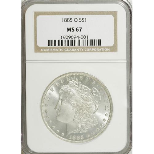 <B>1885-O S$1 MS67 NGC.</B></I> This is one of the most common Morgan dollar issues, and many thousands have been certified in Mint State grades by NGC and PCGS. Even the lowly '85-O is uncommon at the MS67 level, however; and the overall quality of this particular Superb Gem is noteworthy. Lovely mint frost produces an alluring, effulgent sheen across the essentially untoned surfaces. The design elements are sharply defined, and surface marks are limited to a few microscopic nicks. Liberty's cheek and the eagle's breast are pristine.<BR><BR><b>Shipping:</b> Coins & Currency (<a target="_blank" href="http://www.heritageauctions.com/common/shipping.php">view shipping information</a>)