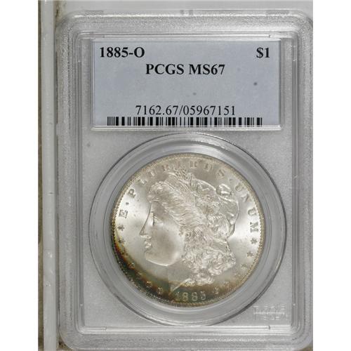 <B>1885-O S$1 MS67 PCGS.</B></I> Bands of powder-blue, ruby-red, gold, and apple-green endow the lower left obverse periphery. This well struck and impressive Superb Gem has a remarkably clean obverse, and the reverse is nearly as smooth.<BR><BR><b>Shipping:</b> Coins & Currency (<a target="_blank" href="http://www.heritageauctions.com/common/shipping.php">view shipping information</a>)