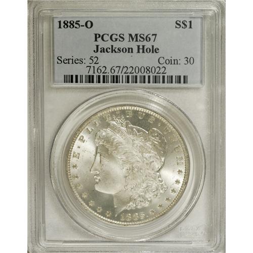 <B>1885-O S$1 MS67 PCGS.</B></I> Ex: Jackson Hole. This is a beautifully frosty, minimally toned, well balanced example of the 1885-O Morgan dollar. The striking detail is remarkably fine, especially above the ear and on the eagle's breast, where New Orleans Mint emissions are so often weak. An attractive Superb Gem.<BR><I>From The Jackson Hole Collection.</B></I><BR><BR><b>Shipping:</b> Coins & Currency (<a target="_blank" href="http://www.heritageauctions.com/common/shipping.php">view shipping information</a>)