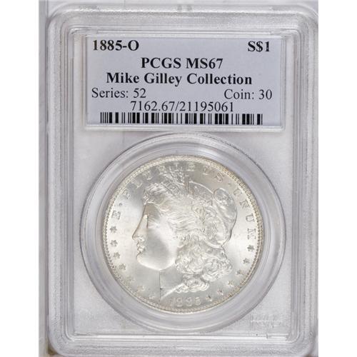 <B>1885-O<img border='0' src='http://www.heritagecoins.com/images/star.gif' width=10 height=10>$1> MS67 PCGS.</B></I> Ex: Mike Gilley Collection. Bright and fully lustrous with an especially clean appearance for this issue, often seen with heavy bagmarks. PCGS has certified none finer (7/06).