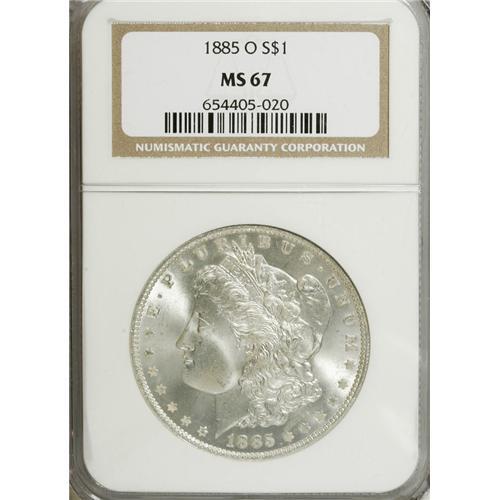<B>1885-O S$1 MS67 PCGS.</B></I> The pearl-gray surfaces exude a beautifully soft, frosty sheen. Boldly struck and well preserved, there are few marks on either side of this compelling Superb Gem.<BR><BR><b>Shipping:</b> Coins & Currency (<a target="_blank" href="http://www.heritageauctions.com/common/shipping.php">view shipping information</a>)