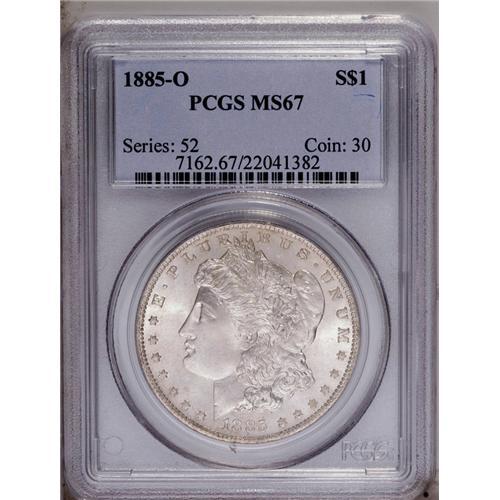 <B>1885-O<img border='0' src='http://www.heritagecoins.com/images/star.gif' width=10 height=10>$1> MS67 PCGS.</B></I> This exquisitely struck Superb Gem features dynamic luster and delicate tawny-gold toning. The portrait and fields are remarkably smooth. Although common in typical Mint State grades, no 1885-O dollars have been certified by PCGS above the MS67 level.