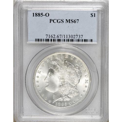 <B>1885-O S$1 MS67 PCGS.</B></I> Well struck for a New Orleans product, since only the hair curl above the ear lacks intricate detail. An impressive Superb Gem that has vivacious cartwheel luster and a splendidly clean appearance.<BR><BR><b>Shipping:</b> Coins & Currency (<a target="_blank" href="http://www.heritageauctions.com/common/shipping.php">view shipping information</a>)