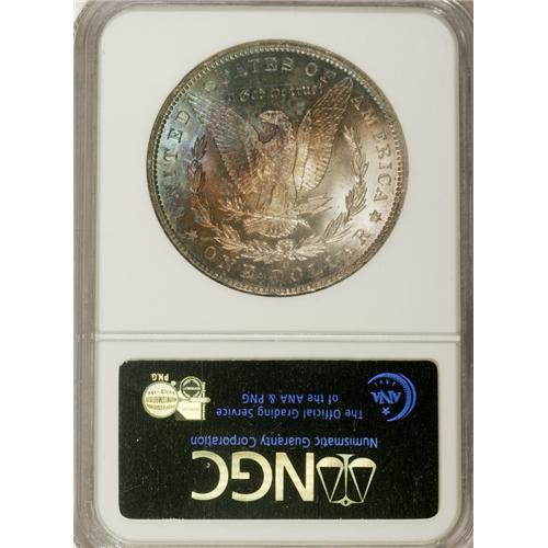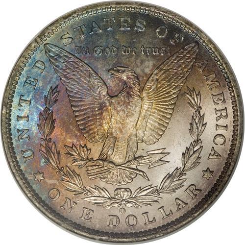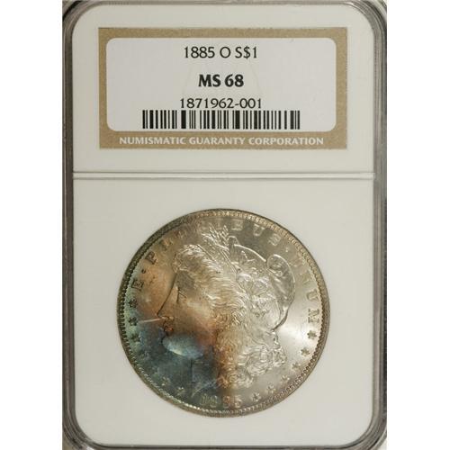 <B>1885-O S$1 MS68 NGC.</B></I> The 1885-O Dollar is one of the most common dates in the Morgan series up to the MS66 level. However, the story changes drastically in grades above that. This is an absolutely pristine, colorfully toned specimen with ultra frosty surfaces. Fully struck, the fields and devices require light magnification to verify <I>any</B></I> coin-to-coin contact. Each side is further enhanced with partial area of rich brick-red, gold, and electric-blue toning. A rare opportunity for the perfectionist. Census: 9 in 68, 0 finer (4/07).<BR><BR><b>Shipping:</b> Coins & Currency (<a target="_blank" href="http://www.heritageauctions.com/common/shipping.php">view shipping information</a>)