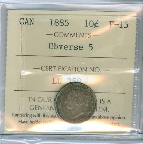 1885 Obv.5 10¢ ICCS F15, a nice and problem free example