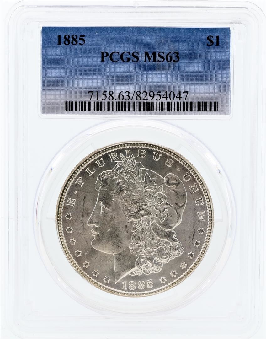 One 1885 PCGS MS63 Morgan Silver Dollar.