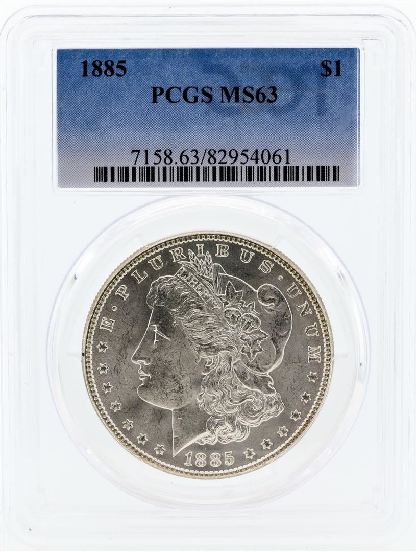 One 1885 PCGS MS63 Morgan Silver Dollar.