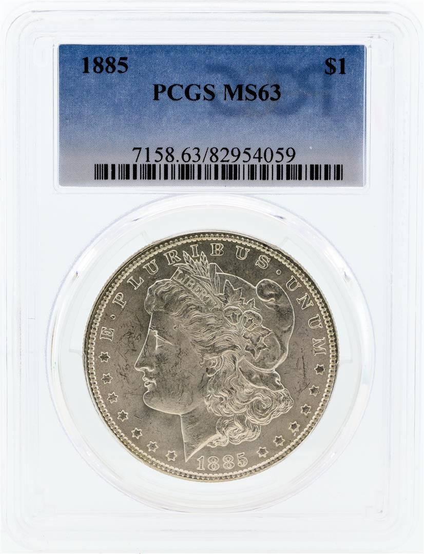 One 1885 PCGS MS63 Morgan Silver Dollar.