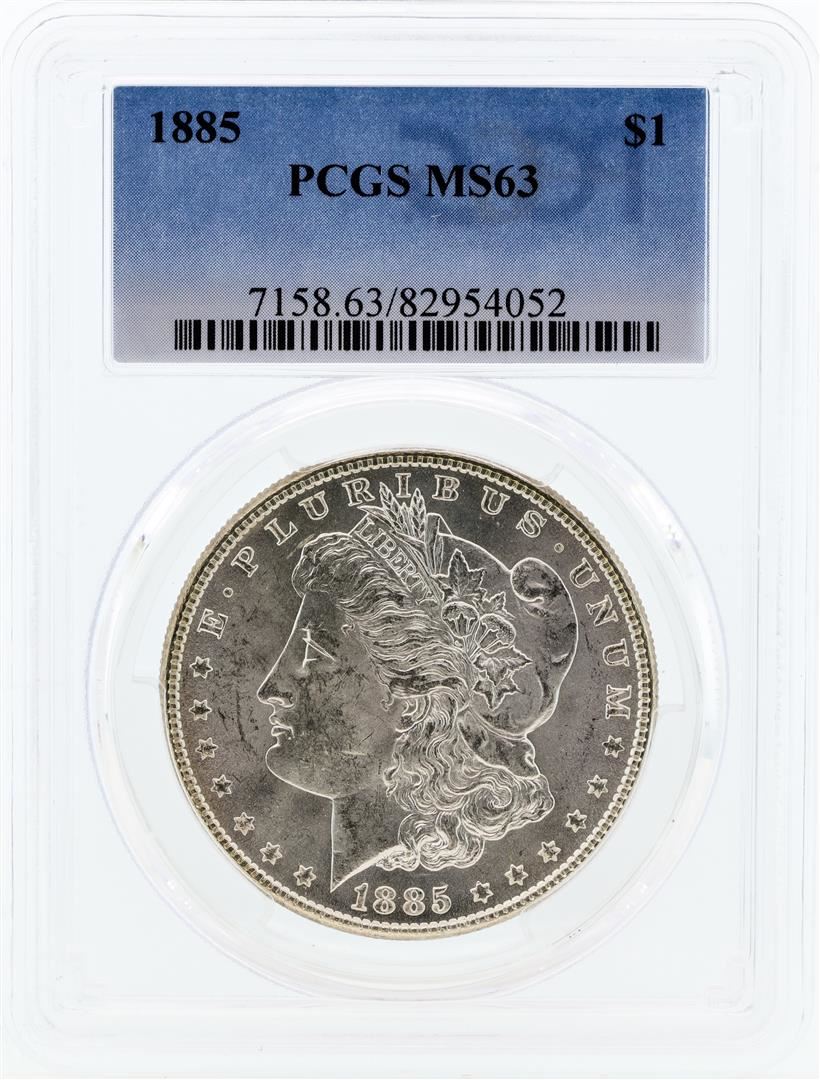 One 1885 PCGS MS63 Morgan Silver Dollar.