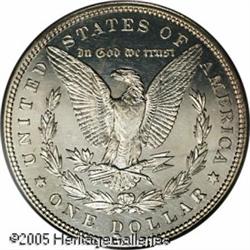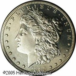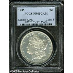 <B>1885<img border='0' src='http://www.heritagecoins.com/images/star.gif' width=10 height=10>$1 PR63 Cameo PCGS.</B></I> This coin is untoned and the color is white overall. Well frosted on the devices and the mirror fields are reflective. Examination will note minor hairlines expected for the grade but this one remains fairly attractive for the moderate grade. An affordable example of one of these truly scarce early Proofs. Lot:10655