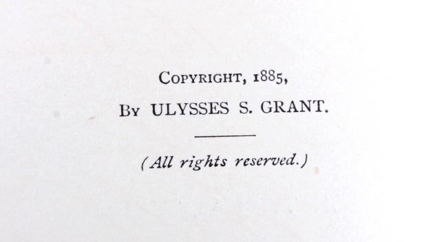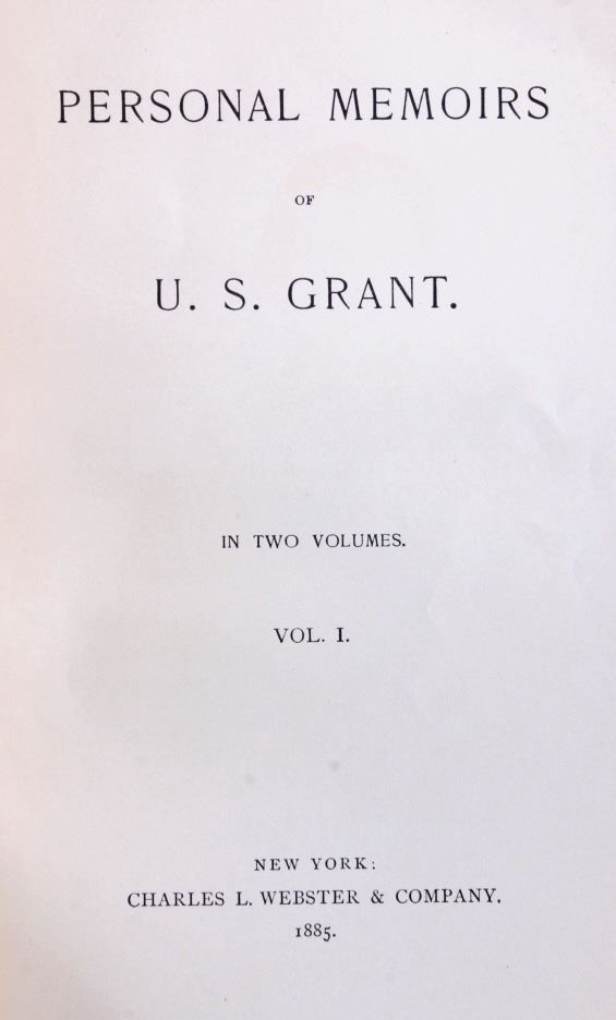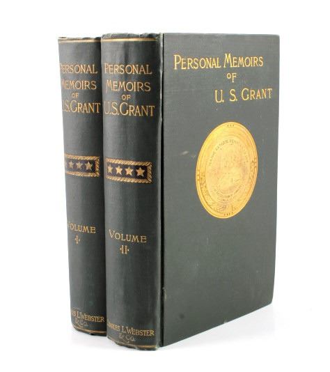 This is a first edition 1885 set of “Personal Memoirs of U.S. Grant” Volume I & Volume II. The books was published in 1885-1886 by Charles L. Webster & Company New York. The books show green cloth covers with gold stamped lettering and seal. The books are a fascinating read with a fold-out of the terms of surrender given to Robert E. Lee. Volume I shows an excellent etching of Grant as a young soldier with Volume II having a portrait of the more known image of President U.S. Grant. These memoirs were written from the fall of 1884 and completed four days before his death July 23, 1885. The set was published by Grant’s friend, Samuel Clemmons (Mark Twain) under the alias of his nephew, Charles L. Webster. This is a quality set and a must own for any Civil War enthusiast. Cover shows some slight wear, but overall a desirable well preserved set. Volume I, after the title page, has a printed signature by Grant. These books measure 6.5"x9 3/8" and each is 1.75" thick.