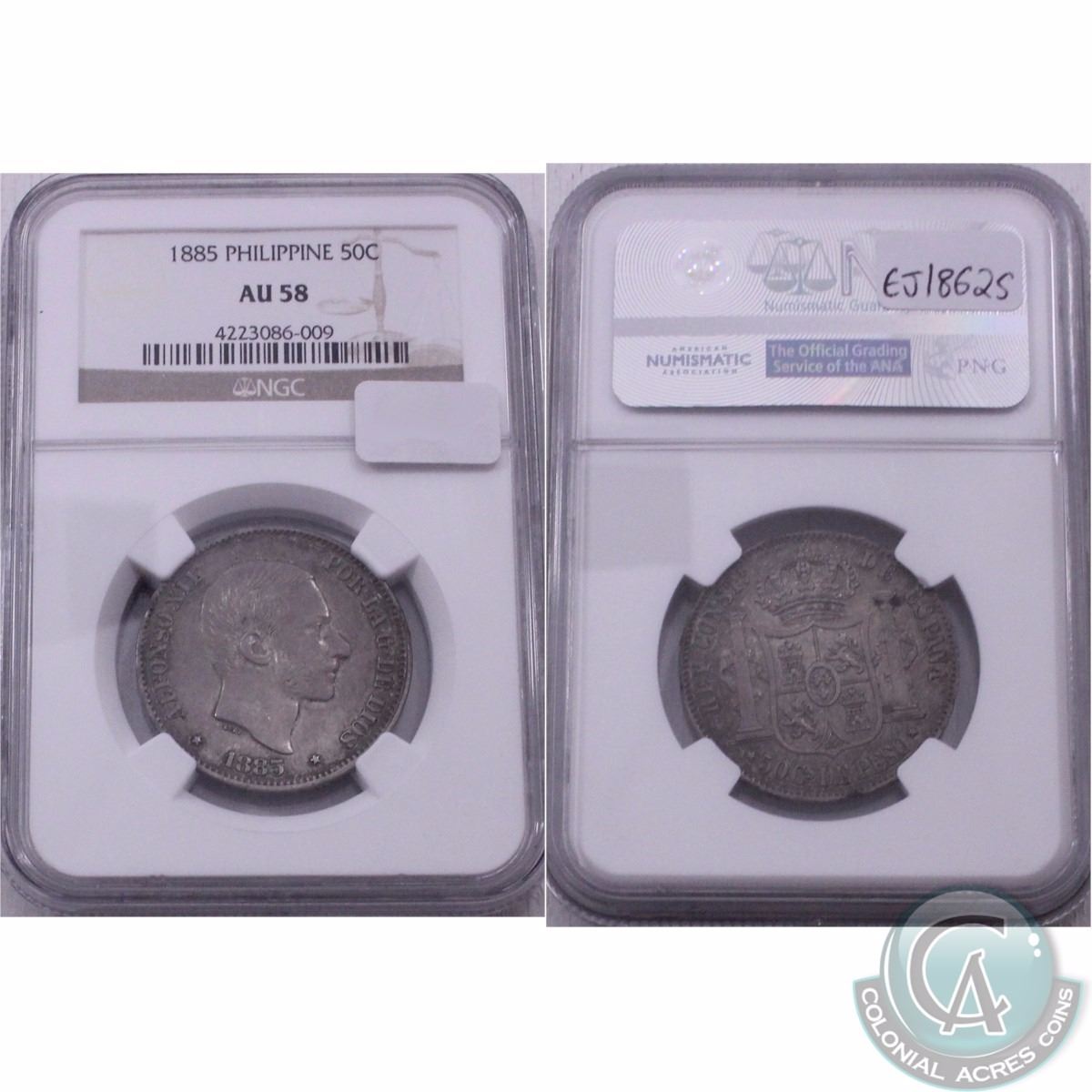 1885 Philippine 50-cent NGC Certified AU-58. Coin comes encased in a protective NGC holder.