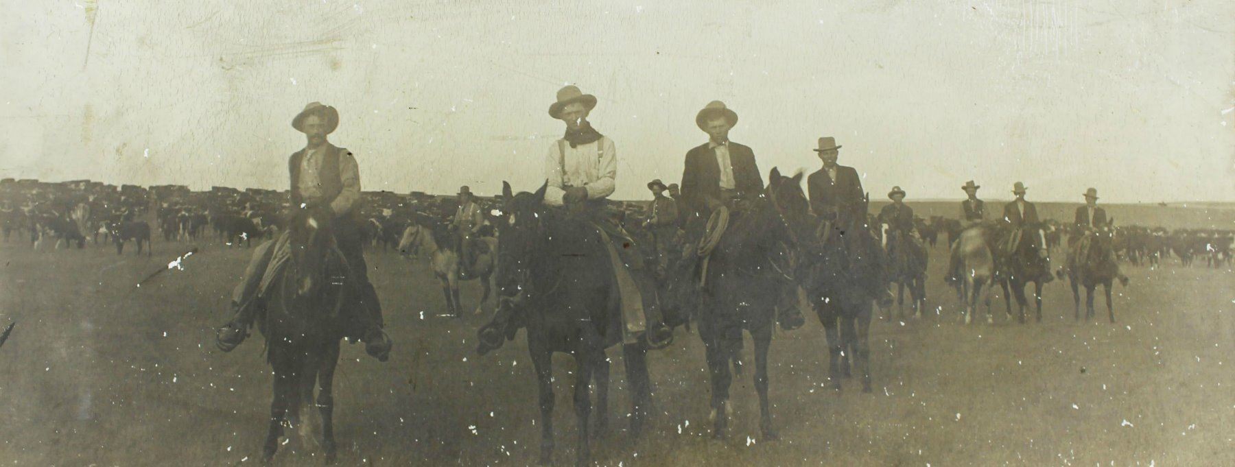 ca 1885- 1890 Pine Ridge, South Dakota cattle round-up large cabinet photo, Henry "Hal" Americus Dawson (b 1856, d 1937 he arrived at Pine Ridge in 1885, he received a license to operate a trading post on the Pine Ridge reservation in 1890, one year after the massacre at Wounded Knee) by family attribution Hal is in the photograph, descending in the family of his son Henry Dawson Jr. (b 1899 Pine Ridge, South Dakota, d 1994 Burlington, VT), image size 9" x 23 3/4", overall size 11 1/4" x 26 1/4"