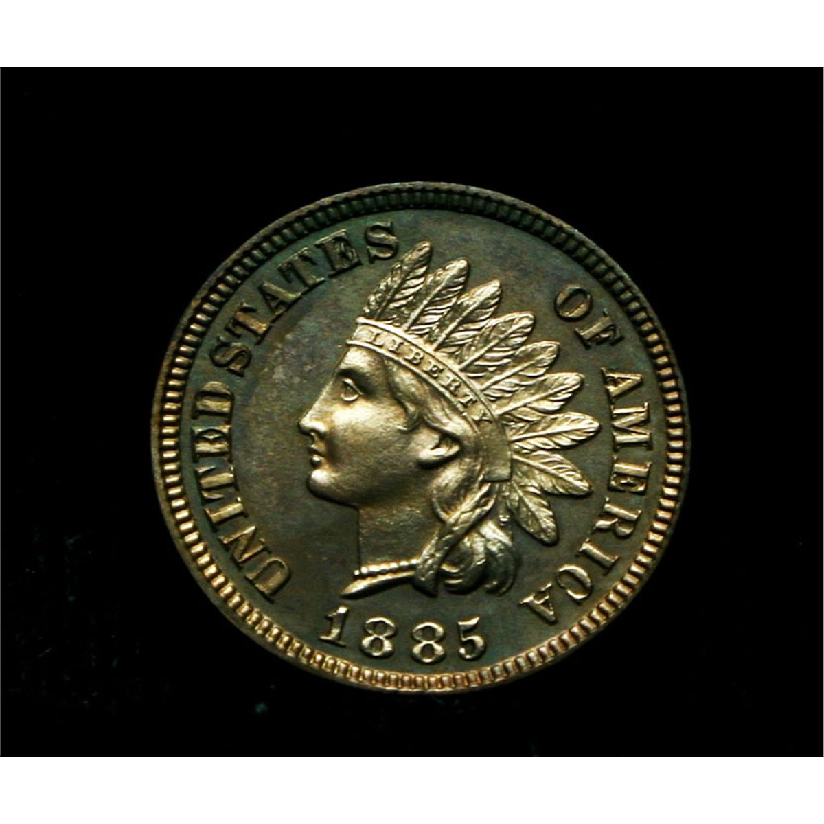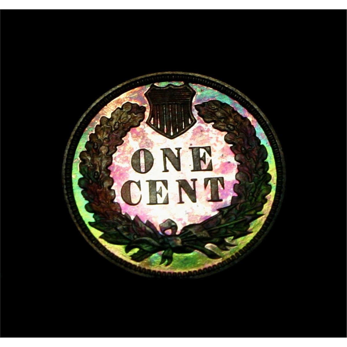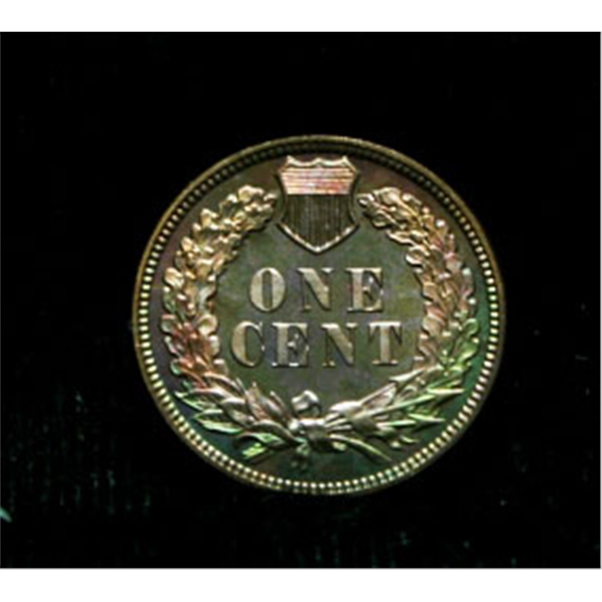 Very attractive Proof Indian Cent. This coin has great deep red color and nice reflective fields. It is a Beautiful Proof. NGC's Price Guide lists a PR65 RD at $1500. The Wholesale Greysheet does not list a price by date for Red Indians. Estimated Value $1250