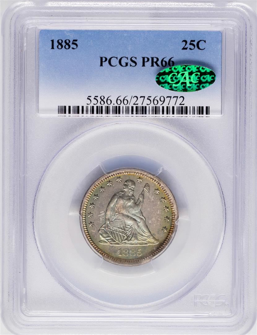 One 1885 Proof Seated Liberty Quarter Coin Coin PCGS PR66 CAC Amazing Toning. PCGS Graded.