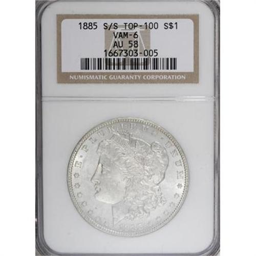 <B>1885-S/S $1 AU58 NGC.</B></I> VAM-6. A Top 100 variety. NGC Census: (143/3473). PCGS Population (101/6076). Mintage: 1,497,000. Numismedia Wsl. Price for NGC/PCGS coin in AU58: $130. (#7164)<BR><BR><B>Coin Engraver:</B> George T. Morgan<BR><BR><b>Shipping:</b> Coins & Currency (<a target="_blank" href="http://www.heritageauctions.com/common/shipping.php">view shipping information</a>)