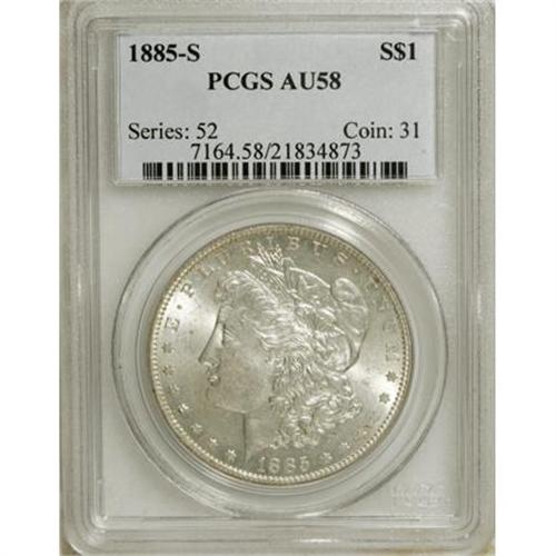 <B>1885-S $1 AU58 PCGS.</B></I> PCGS Population (102/6192). NGC Census: (149/3544). Mintage: 1,497,000. Numismedia Wsl. Price for NGC/PCGS coin in AU58: $130. (#7164)<BR><BR><B>Coin Engraver:</B> George T. Morgan<BR><BR><b>Shipping:</b> Coins & Currency (<a target="_blank" href="http://www.heritageauctions.com/common/shipping.php">view shipping information</a>)
