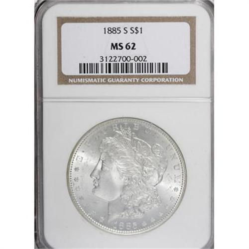 <B>1885-S $1 MS62 NGC.</B></I> . NGC Census: (613/2632). PCGS Population (1203/4541). Mintage: 1,497,000. Numismedia Wsl. Price for NGC/PCGS coin in MS62: $200. (#7164)<BR><BR><B>Coin Engraver:</B> George T. Morgan<BR><BR><b>Shipping:</b> Coins & Currency (<a target="_blank" href="http://www.heritageauctions.com/common/shipping.php">view shipping information</a>)