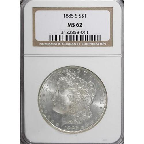 <B>1885-S $1 MS62 NGC.</B></I> NGC Census: (624/2655). PCGS Population (1209/4608). Mintage: 1,497,000. Numismedia Wsl. Price for NGC/PCGS coin in MS62: $200. (#7164)<BR><BR><B>Coin Engraver:</B> George T. Morgan<BR><BR><b>Shipping:</b> Coins & Currency (<a target="_blank" href="http://www.heritageauctions.com/common/shipping.php">view shipping information</a>)