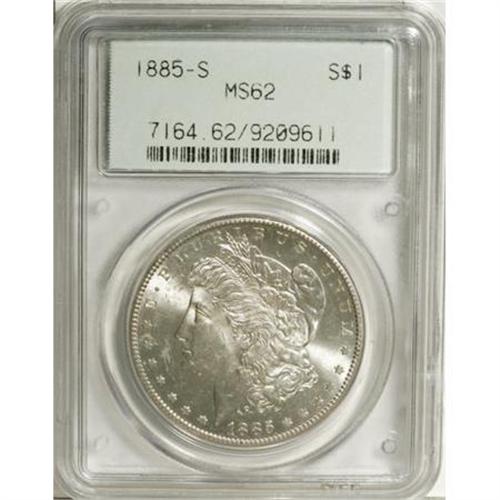 <B>1885-S $1 MS62 PCGS.</B></I> PCGS Population (1196/4439). NGC Census: (593/2559). Mintage: 1,497,000. Numismedia Wsl. Price for NGC/PCGS coin in MS62: $200. (#7164)<BR><BR><B>Coin Engraver:</B> George T. Morgan<BR><BR><b>Shipping:</b> Coins & Currency (<a target="_blank" href="http://www.heritageauctions.com/common/shipping.php">view shipping information</a>)