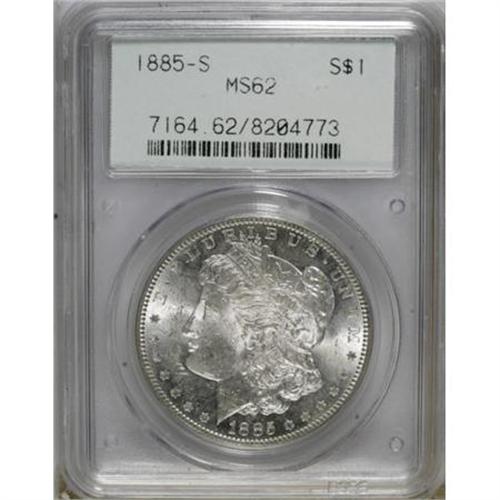 <B>1885-S $1 MS62 PCGS.</B></I> PCGS Population (1208/4582). NGC Census: (614/2642). Mintage: 1,497,000. Numismedia Wsl. Price for NGC/PCGS coin in MS62: $200. (#7164)<BR><BR><B>Coin Engraver:</B> George T. Morgan<BR><BR><b>Shipping:</b> Coins & Currency (<a target="_blank" href="http://www.heritageauctions.com/common/shipping.php">view shipping information</a>)