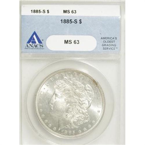<B>1885-S $1 MS63 ANACS.</B></I> NGC Census: (1200/1359). PCGS Population (2261/2188). Mintage: 1,497,000. Numismedia Wsl. Price for NGC/PCGS coin in MS63: $250. (#7164)<BR><BR><B>Coin Engraver:</B> George T. Morgan<BR><BR><b>Shipping:</b> Coins & Currency (<a target="_blank" href="http://www.heritageauctions.com/common/shipping.php">view shipping information</a>)