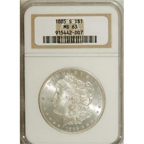 <B>1885-S $1 MS63 NGC.</B></I> NGC Census: (1191/1354). PCGS Population (2215/2124). Mintage: 1,497,000. Numismedia Wsl. Price for NGC/PCGS coin in MS63: $250. (#7164)<BR><BR><B>Coin Engraver:</B> George T. Morgan<BR><BR><b>Shipping:</b> Coins & Currency (<a target="_blank" href="http://www.heritageauctions.com/common/shipping.php">view shipping information</a>)