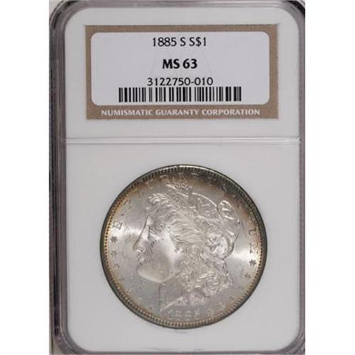 <B>1885-S $1 MS63 NGC.</B></I> NGC Census: (1240/1395). PCGS Population (2294/2283). Mintage: 1,497,000. Numismedia Wsl. Price for NGC/PCGS coin in MS63: $250. (#7164)<BR><BR><B>Coin Engraver:</B> George T. Morgan<BR><BR><b>Shipping:</b> Coins & Currency (<a target="_blank" href="http://www.heritageauctions.com/common/shipping.php">view shipping information</a>)